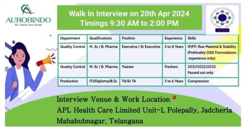 Welcome to AUROBINDO APL Health Care Limited’s exclusive walk-in interview event! We are seeking talented individuals to join our dynamic team in various departments. Read on to discover exciting career opportunities tailored to your expertise.