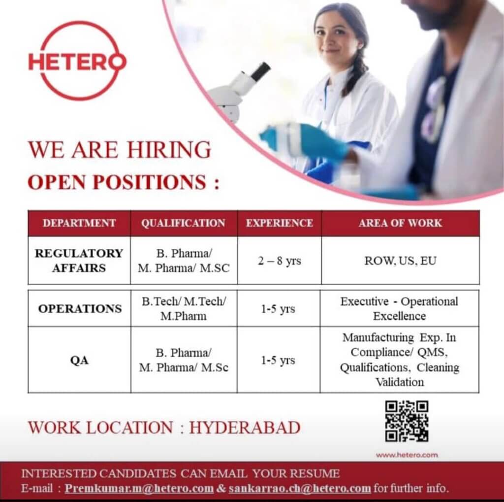 Are you ready to kickstart your career in the pharmaceutical industry? Look no further than HETERO! With open positions in Regulatory Affairs and Operations departments, this renowned company is seeking talented individuals like you to join its team. This content brief will provide you with all the necessary details to secure a position at HETERO.